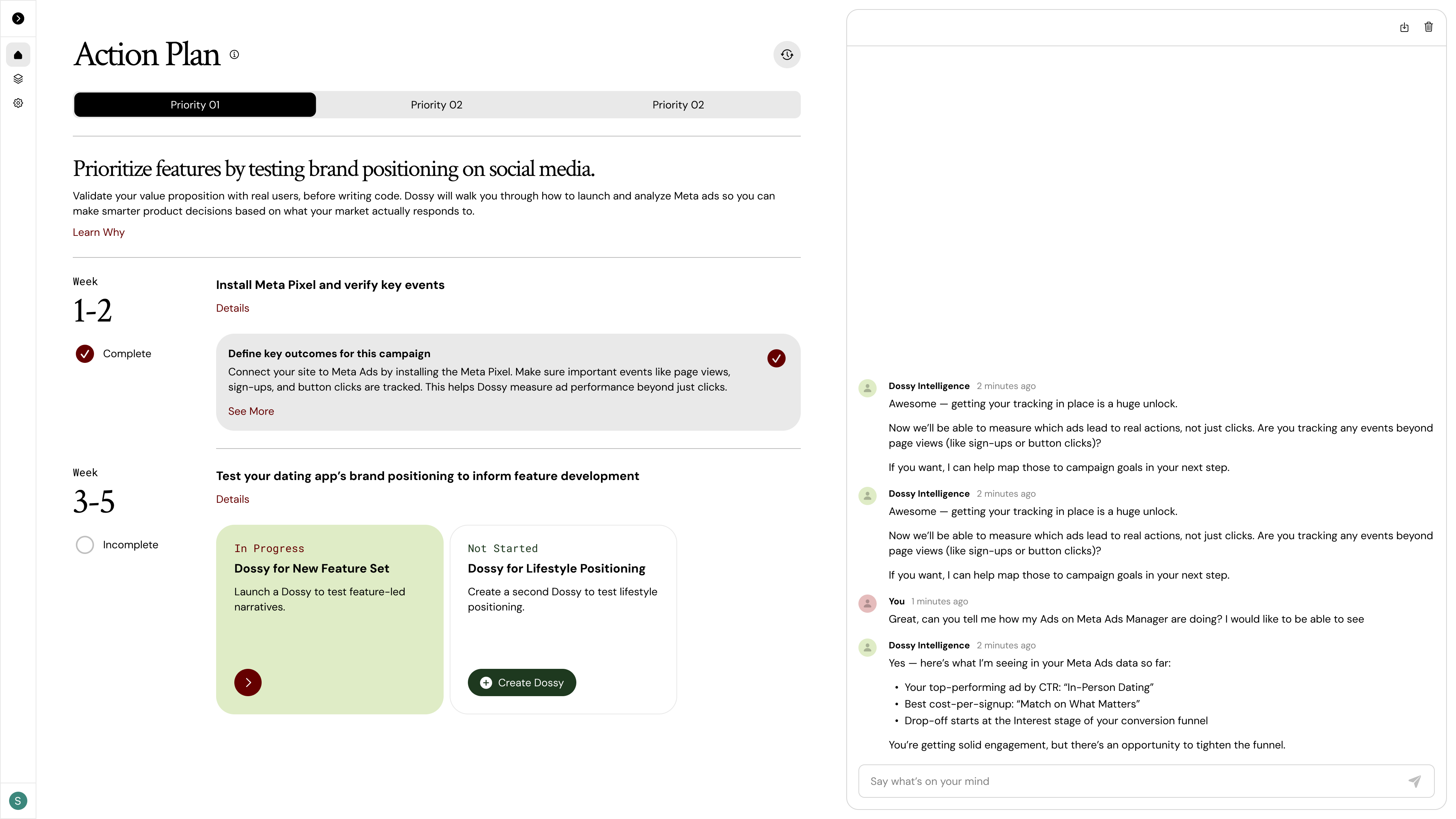 Dossy keeps you grounded in truth. It listens to you and your market, learns from your work, and reveals where your story holds, and where it breaks.
